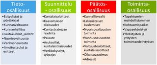 - Päätösosallisuus: voit osallistua itseäsi tai esim. asuinaluettasi koskevan päätöksenteon valmisteluun ja päätöksentekoon