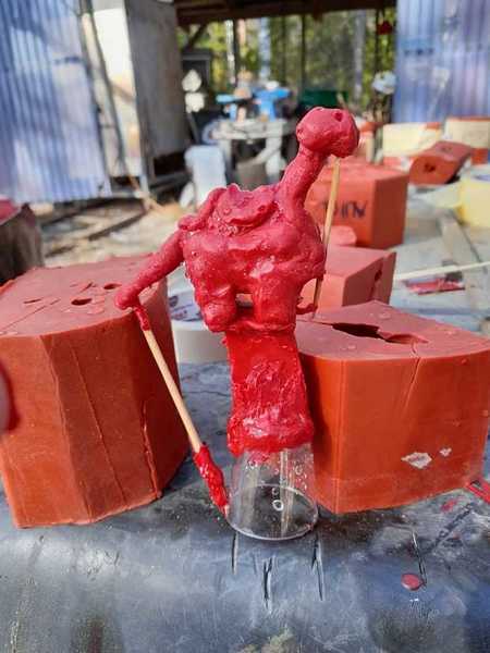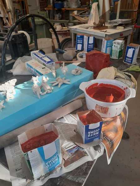 Eino teki suloisista savihahmoista kumimuotit, jonka jälkeen hahmot valettiin juustonkuorivahasta ja hahmoihin tehtiin valukanavat.