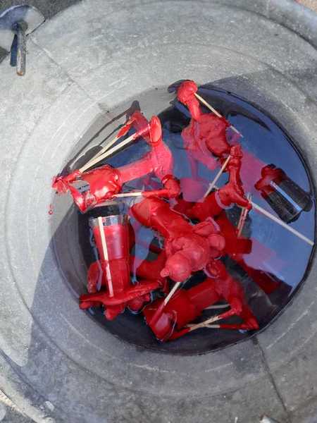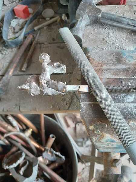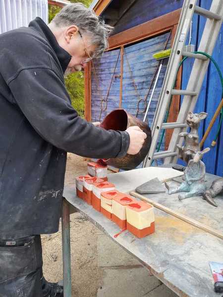 Pronssin jäähdyttyä veistoksista koputellaan irti kaikki ylimääräinen massa ja valukanavat rälläköidään irti.